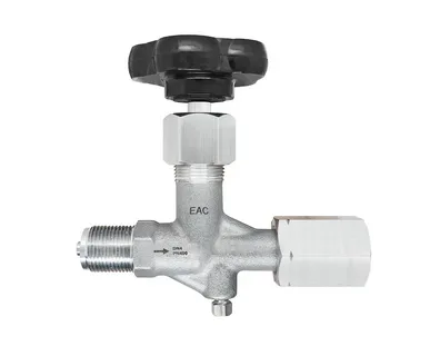 Клапан оснащен винтом для сброса давления, который позволяет осуществлять демонтаж и замену СИ (средство измерения) без остановки линии. Тестовый порт с заглушкой позволяет осуществить подключение контрольного манометра к системе без остановки технологического процесса.