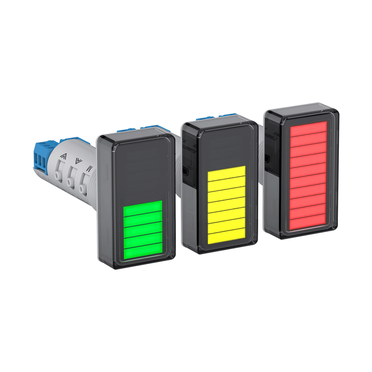 Типовые применения с качественным отображением параметра и сменой цвета от нормального уровня сигнала (зеленый) до предупредительного (желтый) и критического (красный) связаны с условиями: