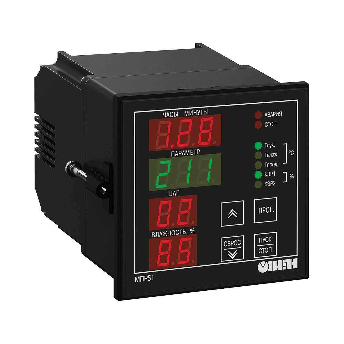 МПР51-Щ4 имеет в своем составе 2 ПИД-регулятора, которые обеспечивают точное поддержание любых двух из пяти измеренных и вычисленных параметров: Тсух, Твлаж, Тпрод,