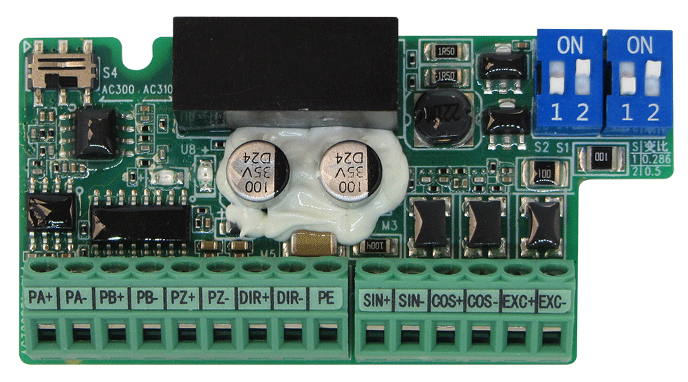Плата ПРЕ1 предназначена для подключения резольверов в качестве обратной связи по скорости. Дополнительно плата оснащена эмулятором выходного сигнала квадратурного энкодера с дифференциальным выходом. Плата предназначена для работы с ПЧВ3 [M01].