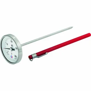 Тип БТ, серия 220. Биметаллический коррозионностойкий погружной термометр со штоком в виде иглы предназначен для измерения температуры густых, сыпучих и вязких сред. Принцип действия прибора основан на зависимости деформации чувствительного элемента от измеряемой температуры. В качестве такого элемента используется пружина из биметалла. Она изготавливается из двух прочно соединенных металлических пластин, имеющих различные температурные коэффициенты линейного расширения. При изменении температуры пружина изгибается и вращает стрелку прибора. Один её конец закреплен внутри штока, а к другому присоединяется ось стрелки.